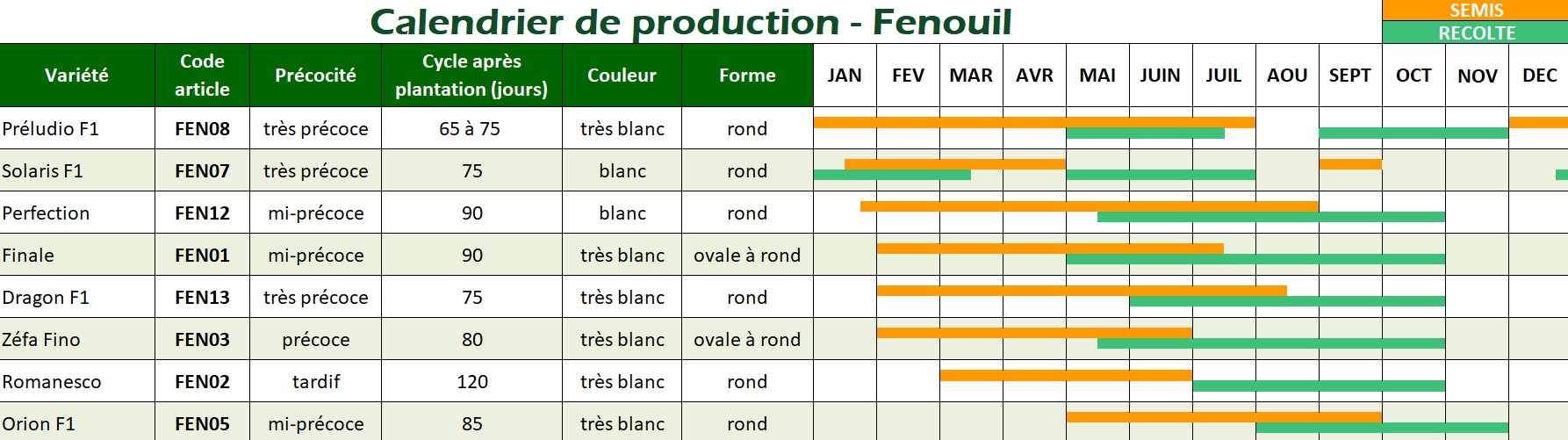 Le fenouil est une plante annuelle, originaire d’Italie, consommée crue en dessert, trapue, à tige très courte. Afin de bien bulber, et d’éviter la montée à graines, choisissez un sol frais et riche. Éclaircissez à 15 cm. Arrosez fréquemment et copieusement. Dès que le fenouil bulbe au niveau du collet, buttez le légèrement. Légume très savoureux, goût sucré et anisé. Plantation entre 15 et 20°C. Suivant les régions, le fenouil hybride peut se semer en toutes saisons, les meilleurs résultats sont obtenus au printemps et en été. Ainsi on peut réaliser plusieurs semis. Ramassez très régulièrement et très vite car sa période de production est très groupée.