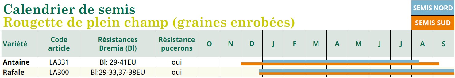Levée : 5 à 8 jours en sol à 18 à 20°C pour les graines enrobées, une température supérieure à 20°C induit une dormance des graines et par conséquent bloque la levée